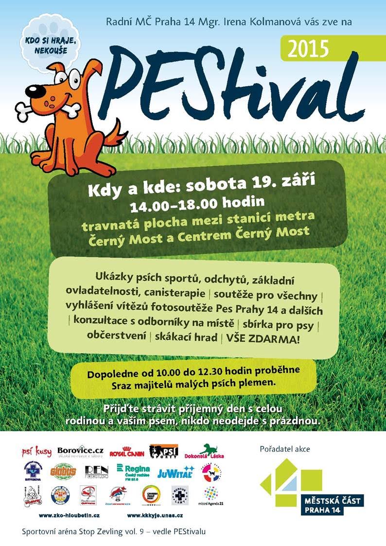 Městská část Praha 14 zve všechny zájemce na v pořadí již třetí ročník akce určené pro všechny psy a jejich majitele – PEStival aneb Kdo si hraje, nekouše 2015. Koná se v sobotu na travnaté ploše mezi stanicí metra Černý Most a Centrem Černý Most. Ukázky psích sportů, odchytů, ovladatelnosti a soutěže. V 10:00 sraz majitelů malých psích plemen.