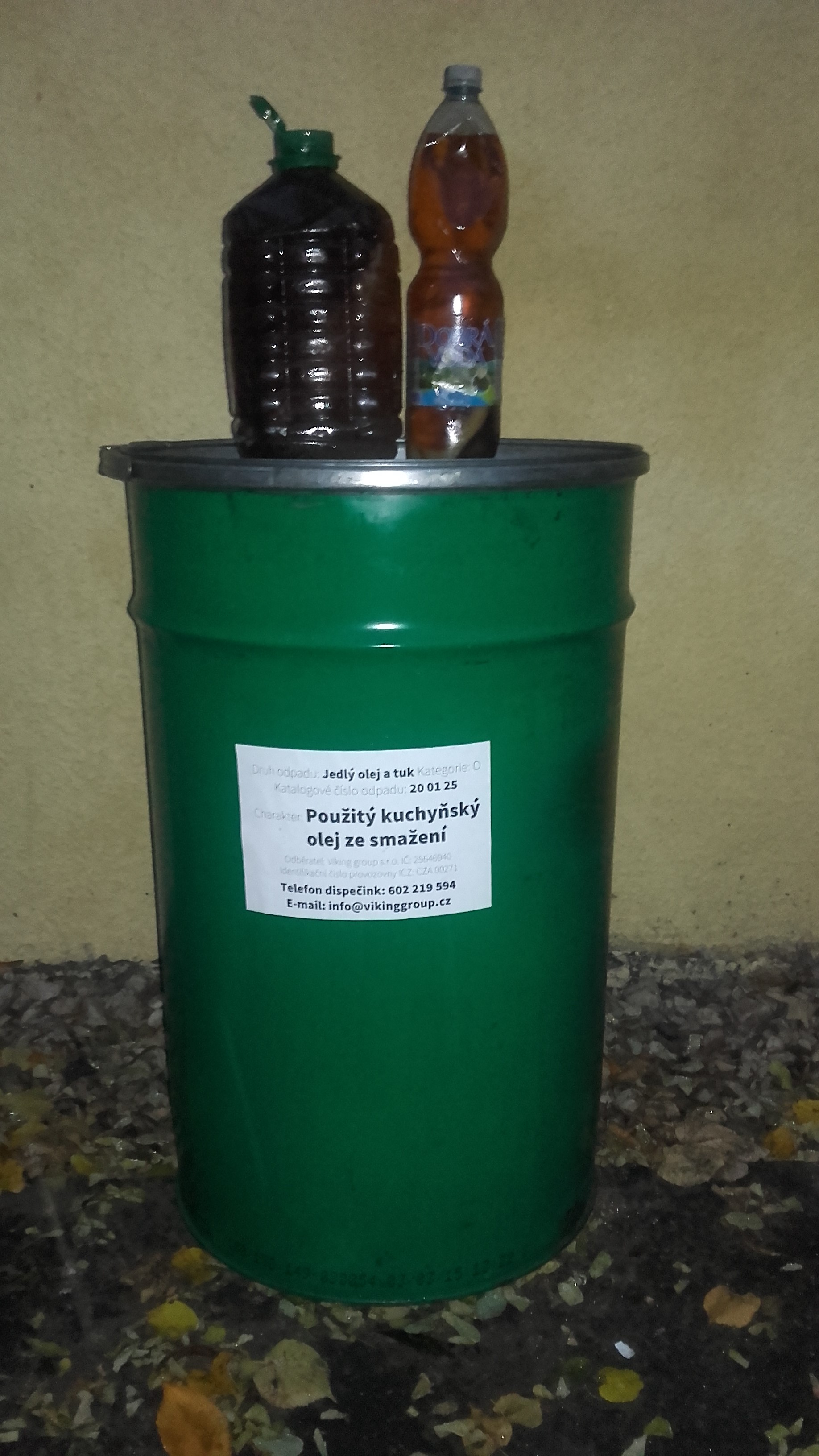 Na každém sběrném dvoře je umístěna nádoba s nálepkou označující, že jde o nádoby určené k odkládání použitých kuchyňských olejů z domácností.